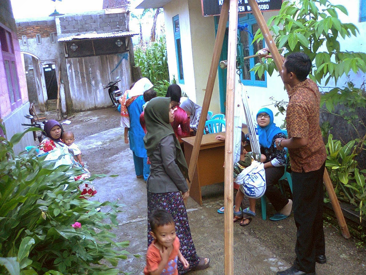 Suara tangis anak balita menghiasi suasana sekitar balaidesa pada pagi ini, suasana yang biasanya tenang di pagi menjelang siang hari menjadi ramai dengan suara tangisan anak balita dan juga canda tawa mereka, anak kecil lalu lalang berlarian di sekitar balaidesa, terlihat pula ibunya tergopoh-gopoh mengejar anaknya yang berlarian itu takutnya lari ke arah jalan raya yang tentu saja akan berbahaya, seorang ibu terlihat menggendong anak dengan selendang jaritnya berjalan menuju ke arah keramaian ini, wanita muda yang tengah hamil duduk menunggu dengan perut buncitnya, seperti itulah gambaran suasana ketika kegiatan posyandu (Pos Pelayanan Terpadu) tengah dilaksanakan.
